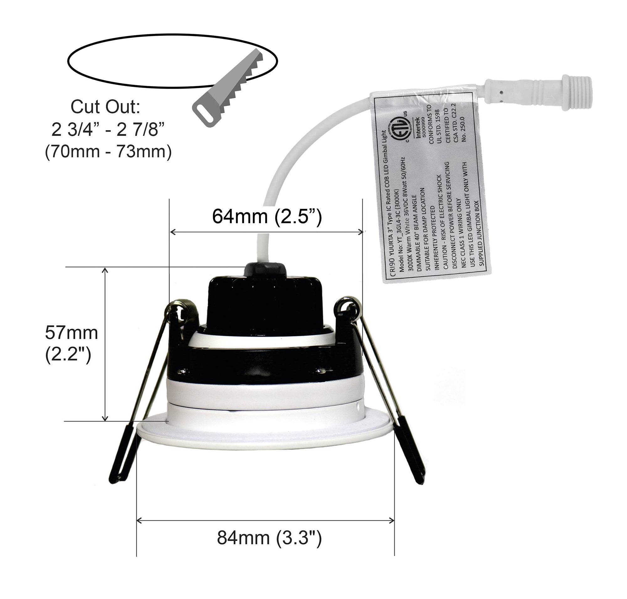 Trim Diameter: 3-5/16" (84mm), Base Diameter: 2-1/2" (64mm), Light Panel Hight: 2-1/4" (56mm).